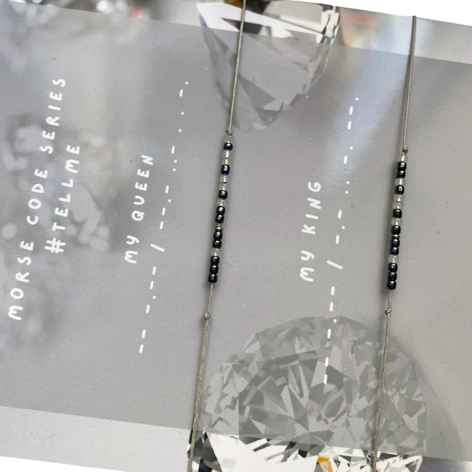Set bratari cuplu in Cod Morse cu mesaj - My king / My Queen Codul Morse este o metoda de transmitere a informatiei folosind semne sau pulsatii scurte si lungi, cunoscute in mod comun ca puncte si linii. O margea gri inchis reprezinta linia, una alba reprezinta punctul iar cea argintie reprezinta spatiul dintre cuvinte.