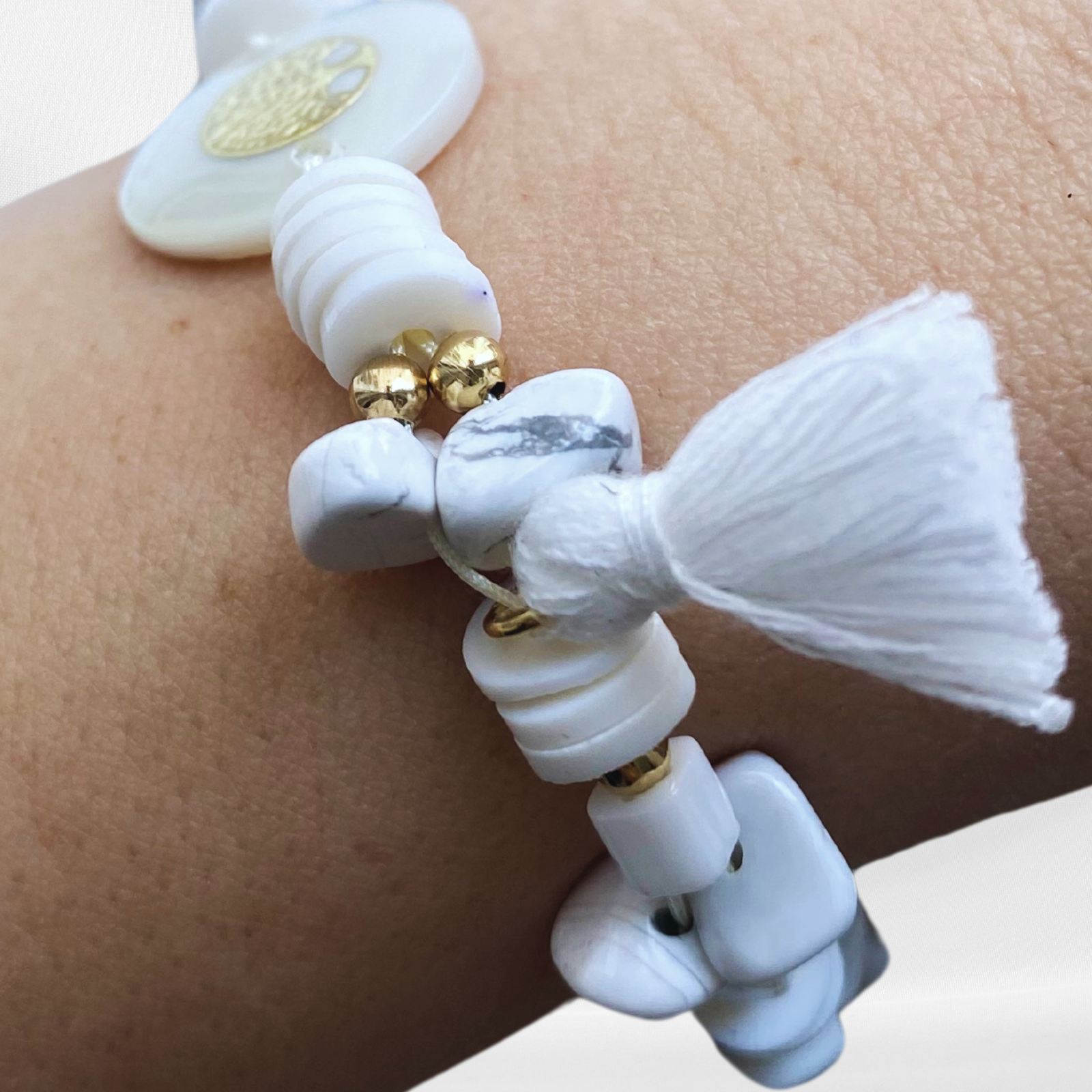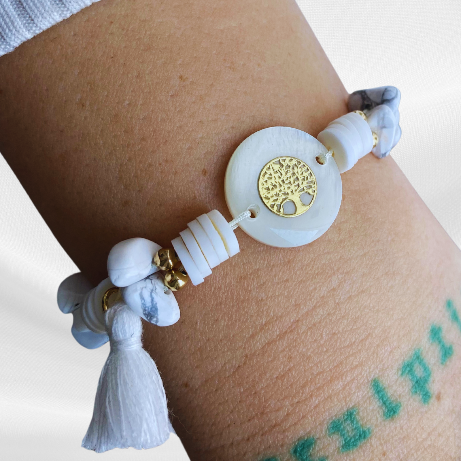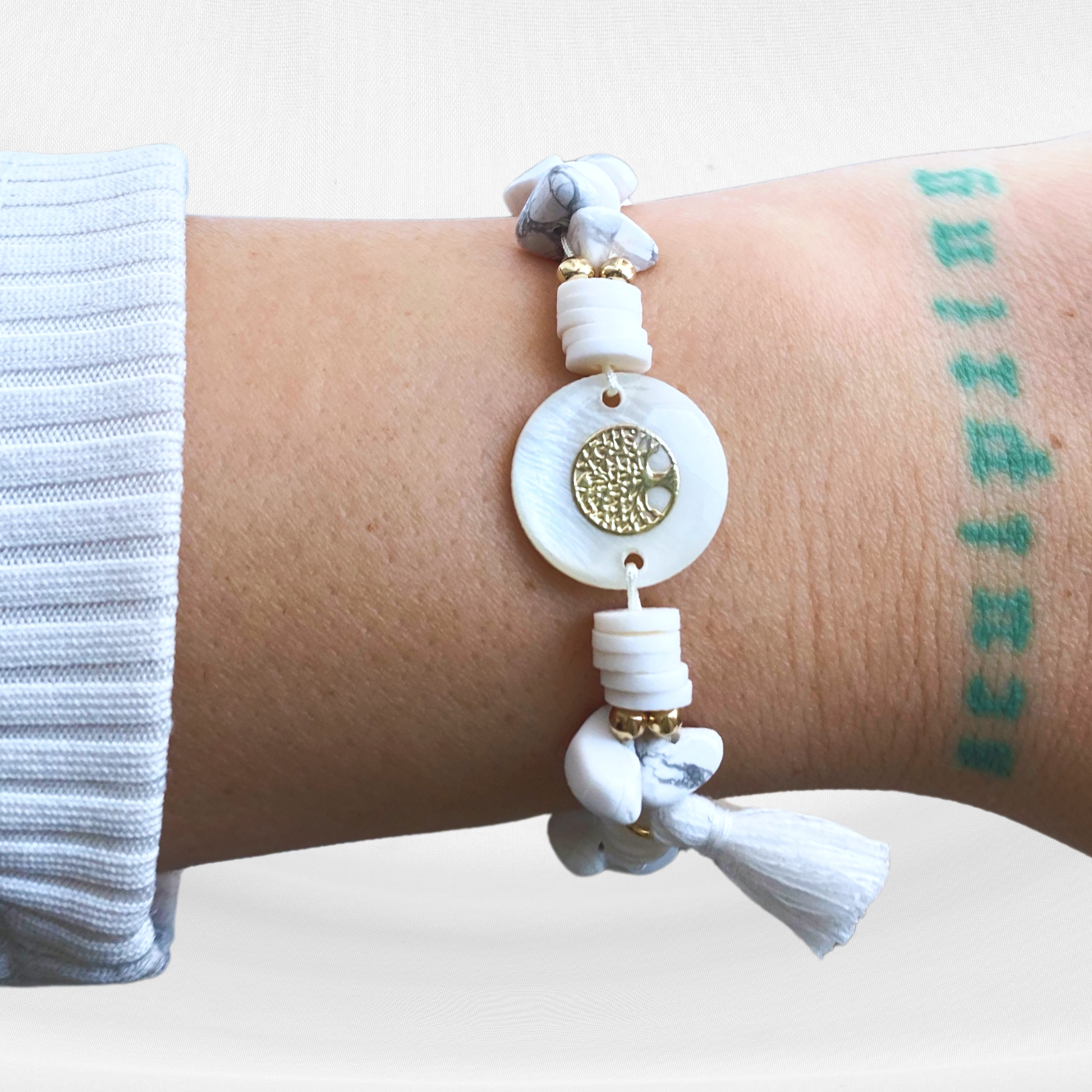 - Realizata cu cristale naturale de howlit alb si accesorii metalice aurii din otel inoxidabil, rondele din lut polimeric, margele din sticla si pandantiv Copacul Vietii din sidef