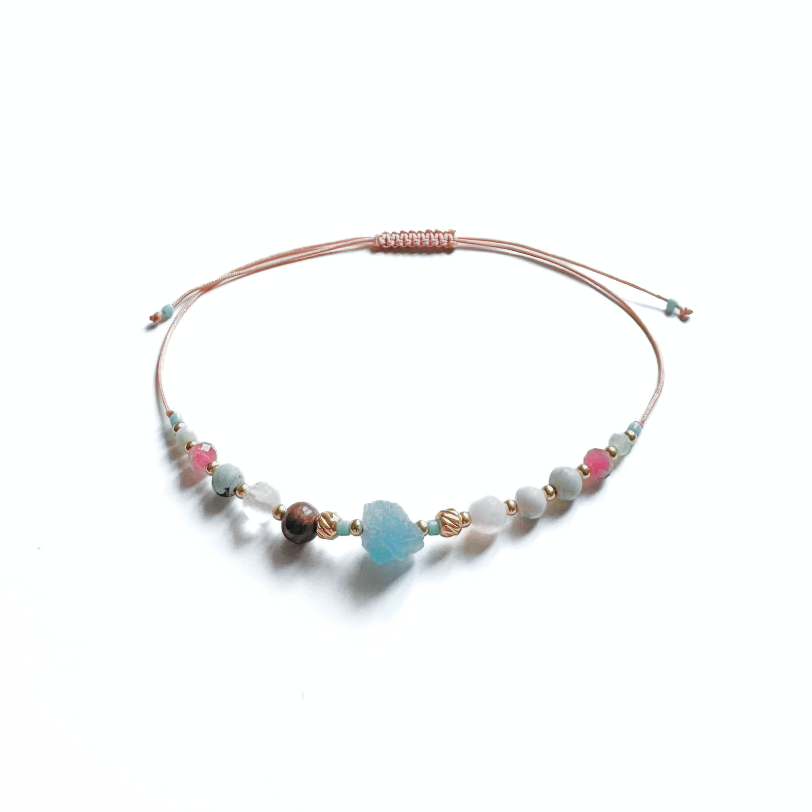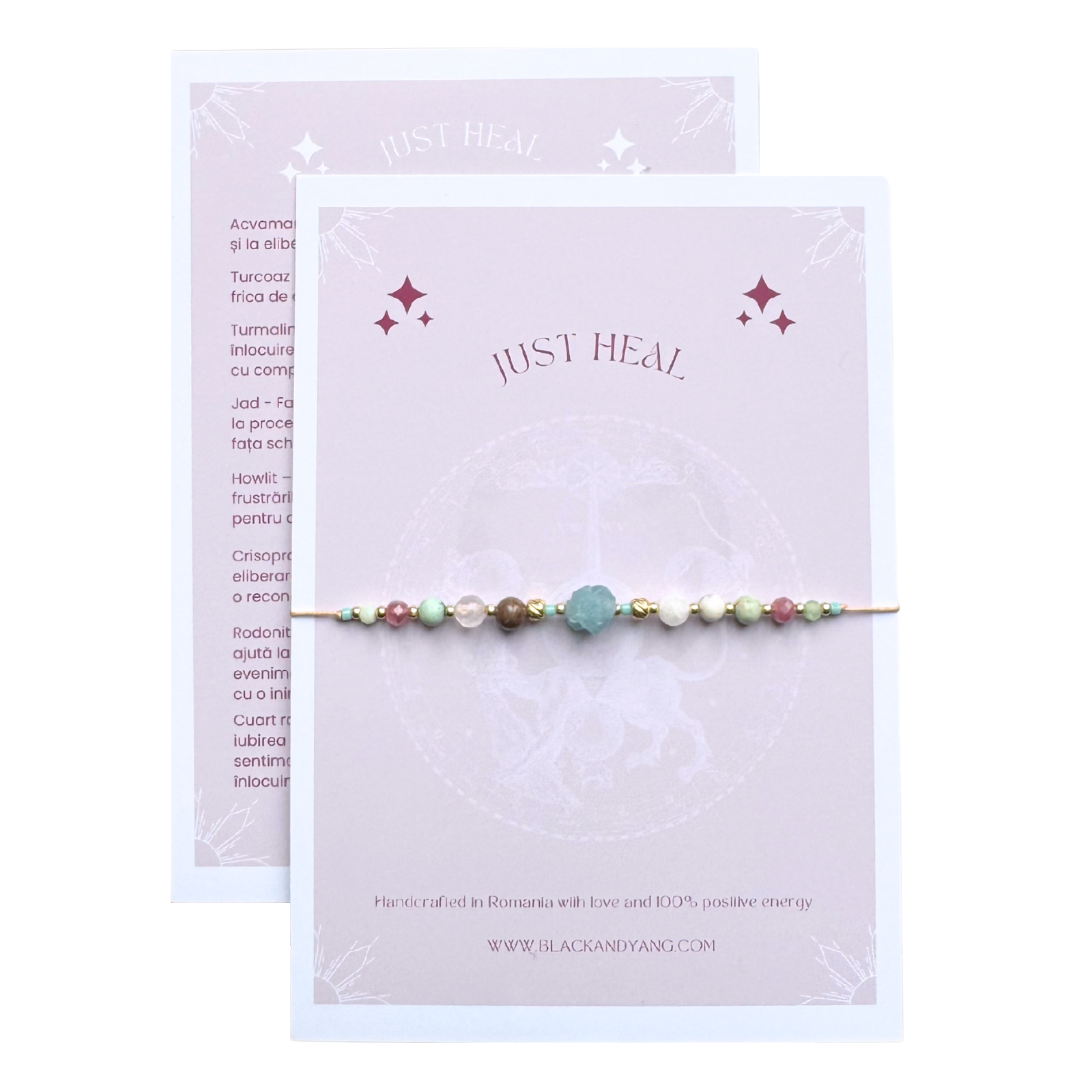 - Realizata cu 8 cristale naturale - acvamarin brut, jad alb, howlit, rodonit, turcoaz, turmalina roz, crisopraz si cuart roz