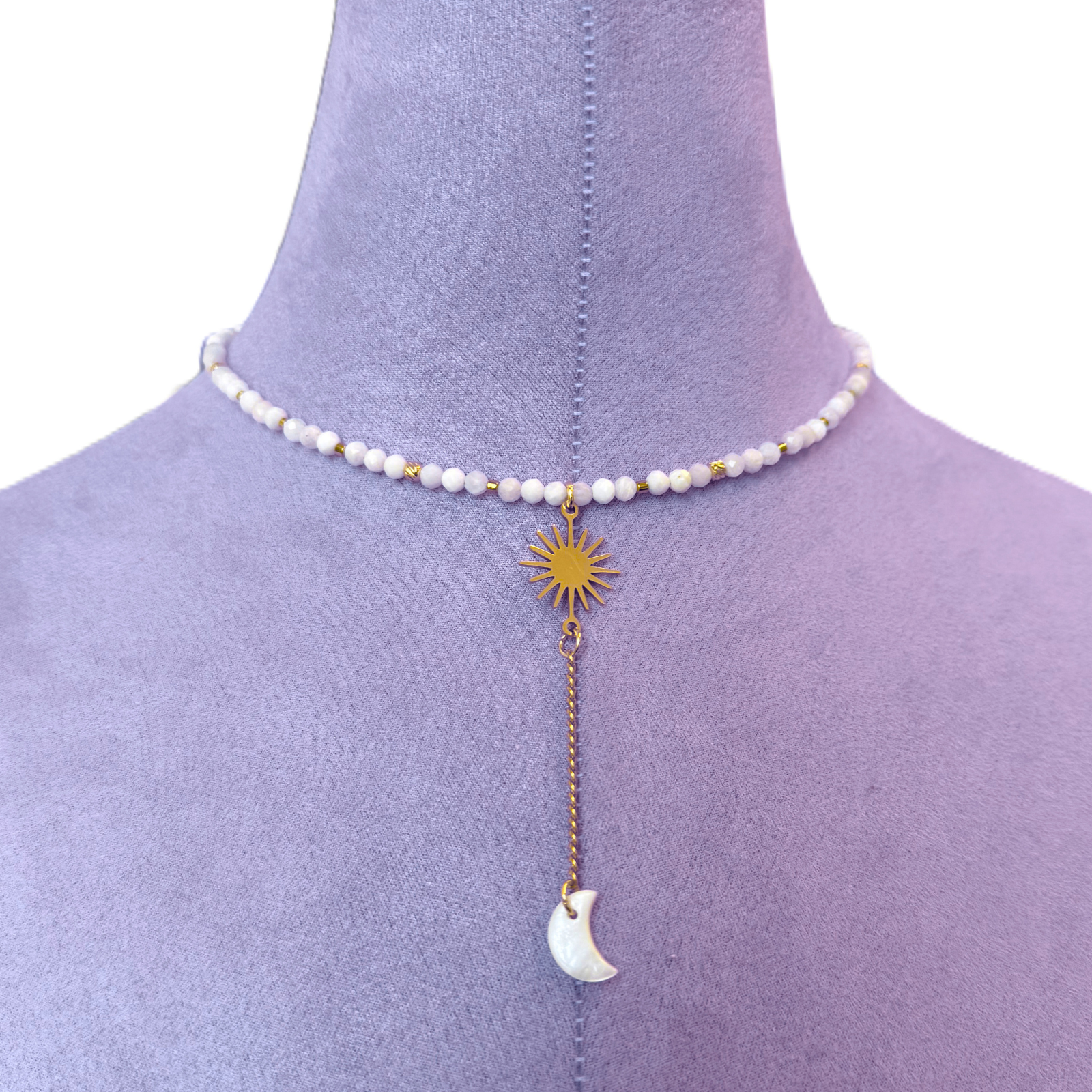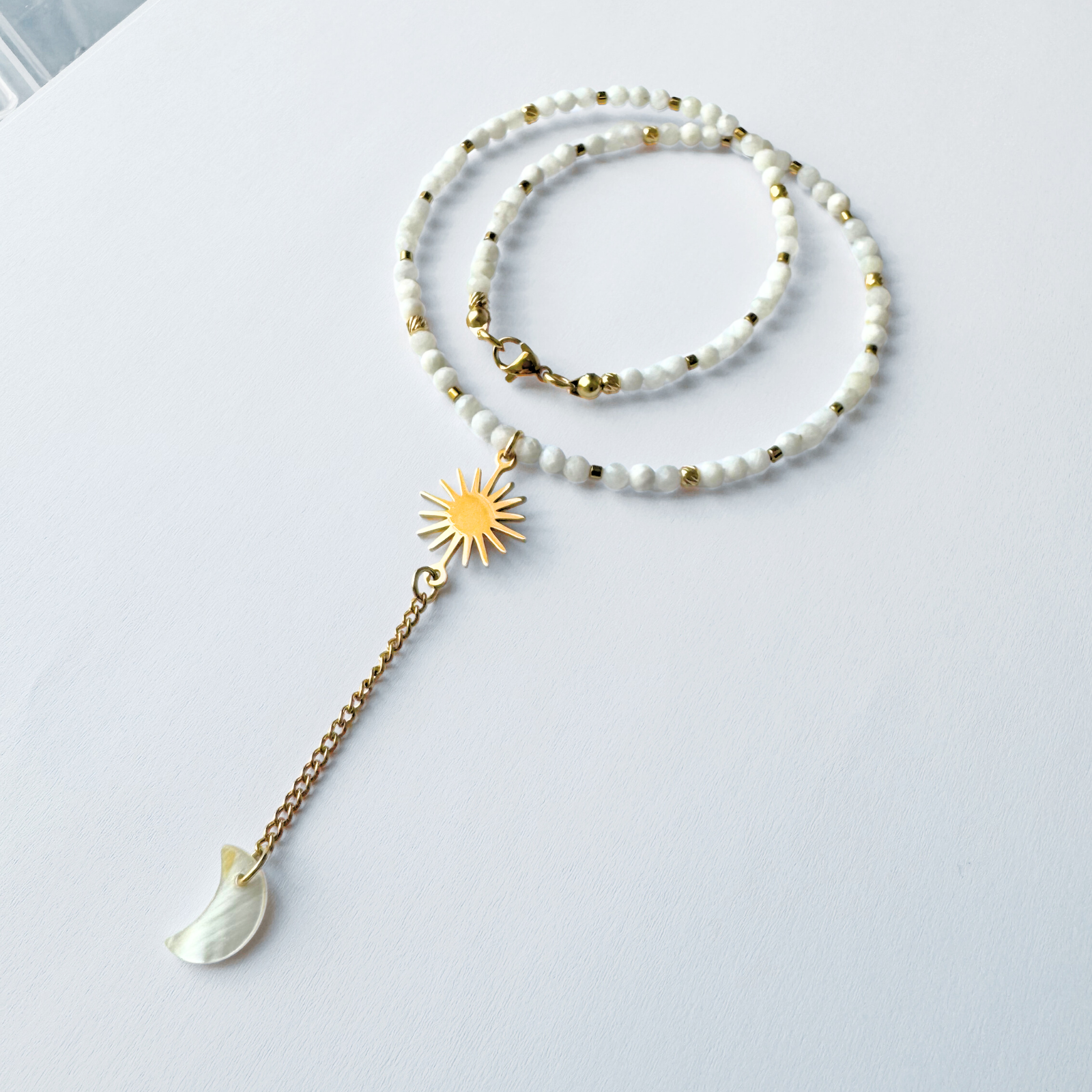 Colier auriu la baza gatului din piatra lunii cu pandantiv soare si luna din sidef