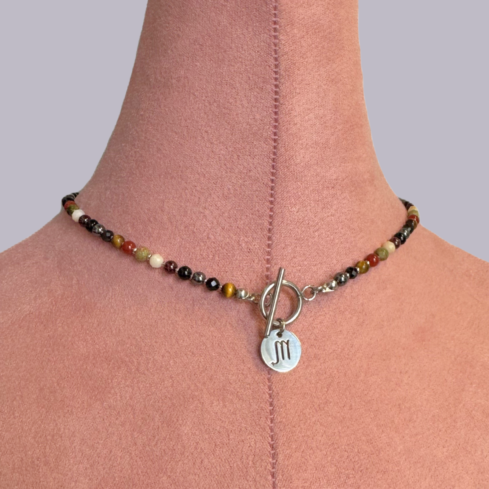 • Realizat cu cristale naturale fatetate de 4 / 4.5 mm : unakit, granat, turmalina neagra, onix, ochi de tigru, opal, carneol, hematit
