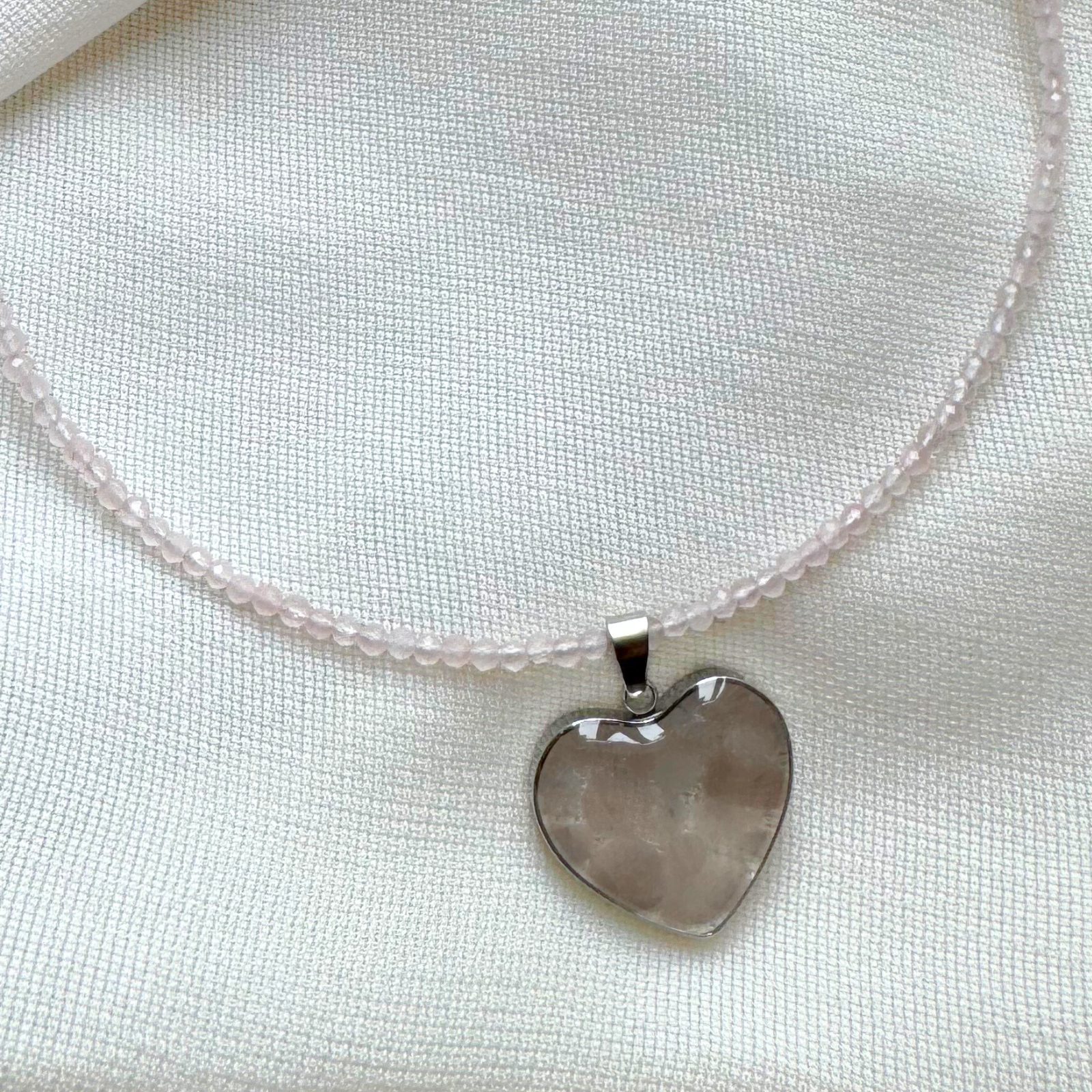 Colier la baza gatului din cuart roz cu pandantiv inima
