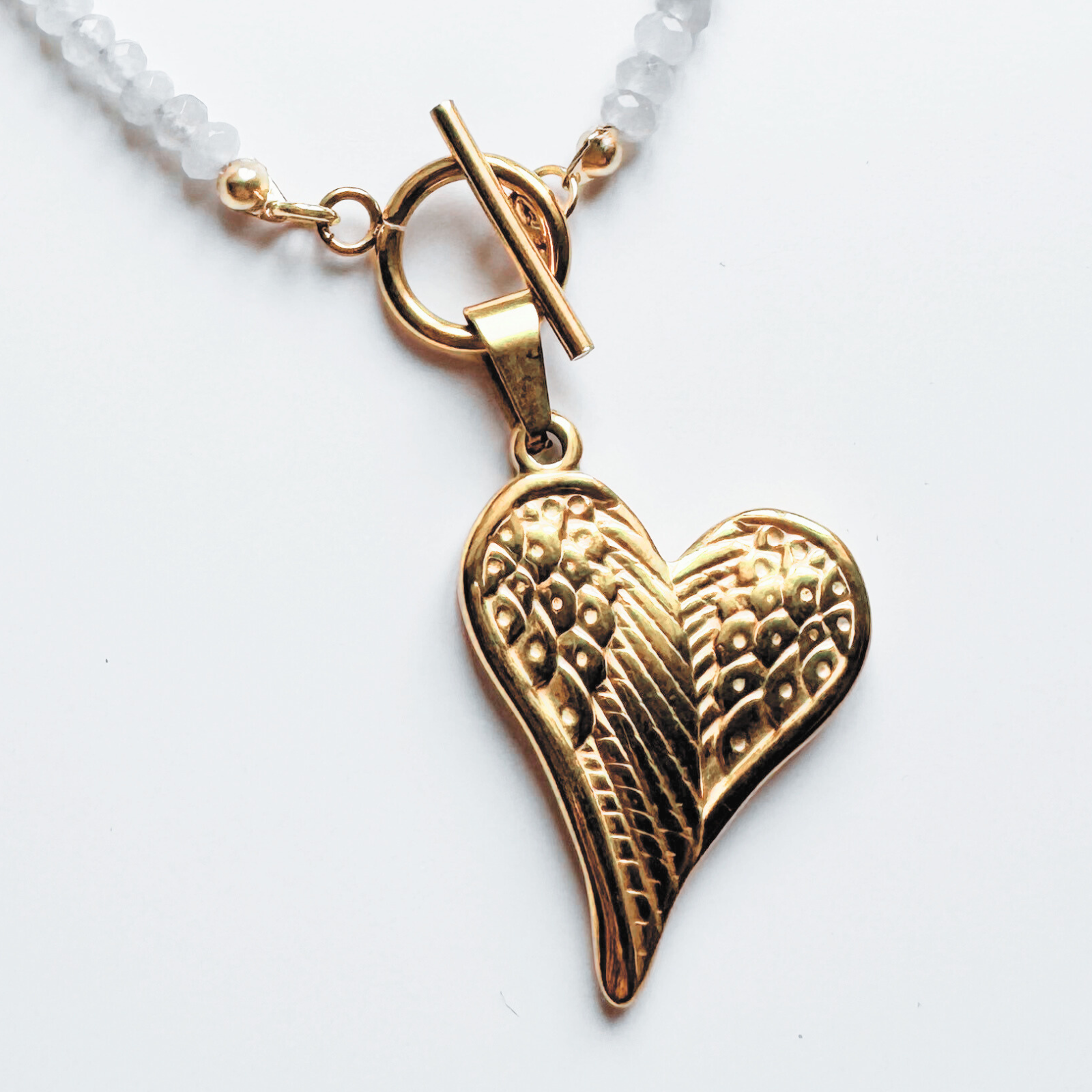 Colier la baza gatului din jad alb cu pandantiv inima auriu si inchizatoare toggle