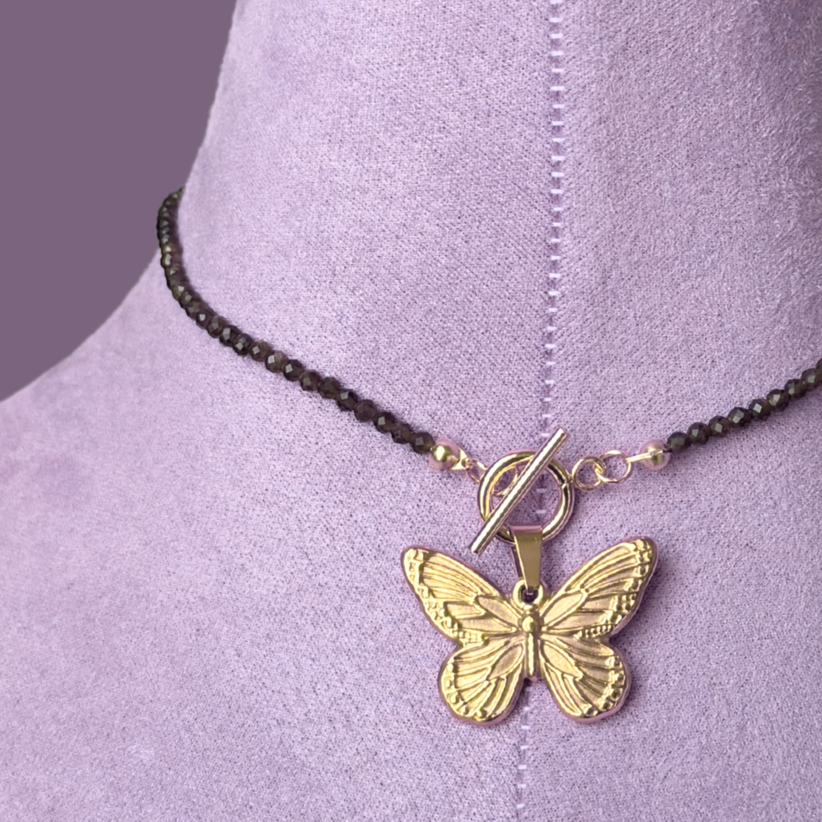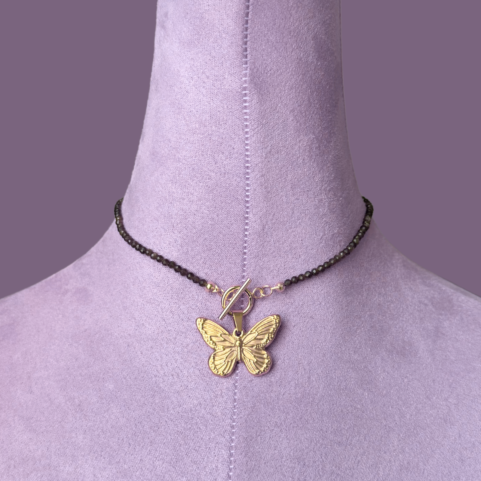 Colier la baza gatului din obsidian auriu cu pandantiv fluture