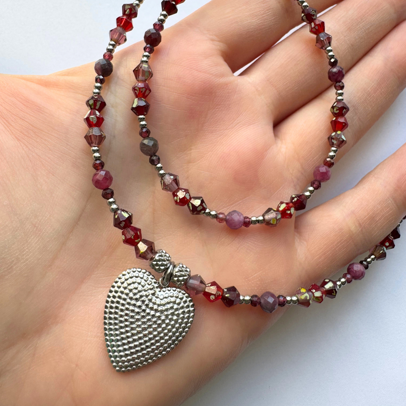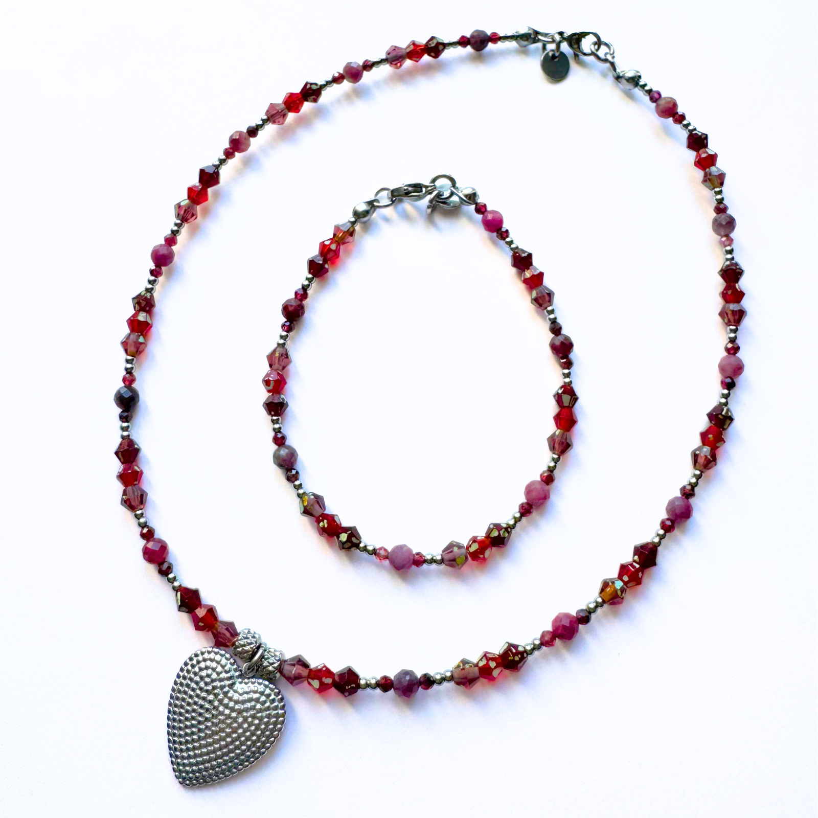 Setul este realizat cu cristale naturale din turmalina roz fatetata 4 / 4.5 mm, granat fatetat 2 mm, cristale din sticla roz, rosii si visinii, cu pete mici verzui