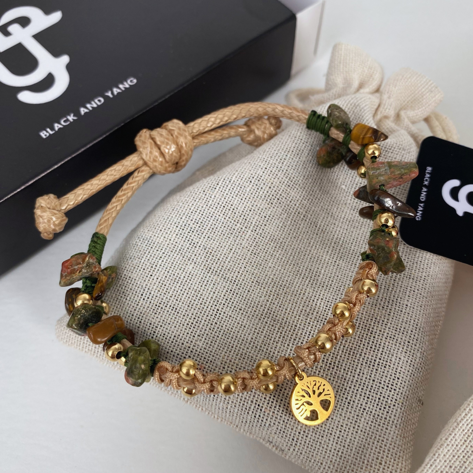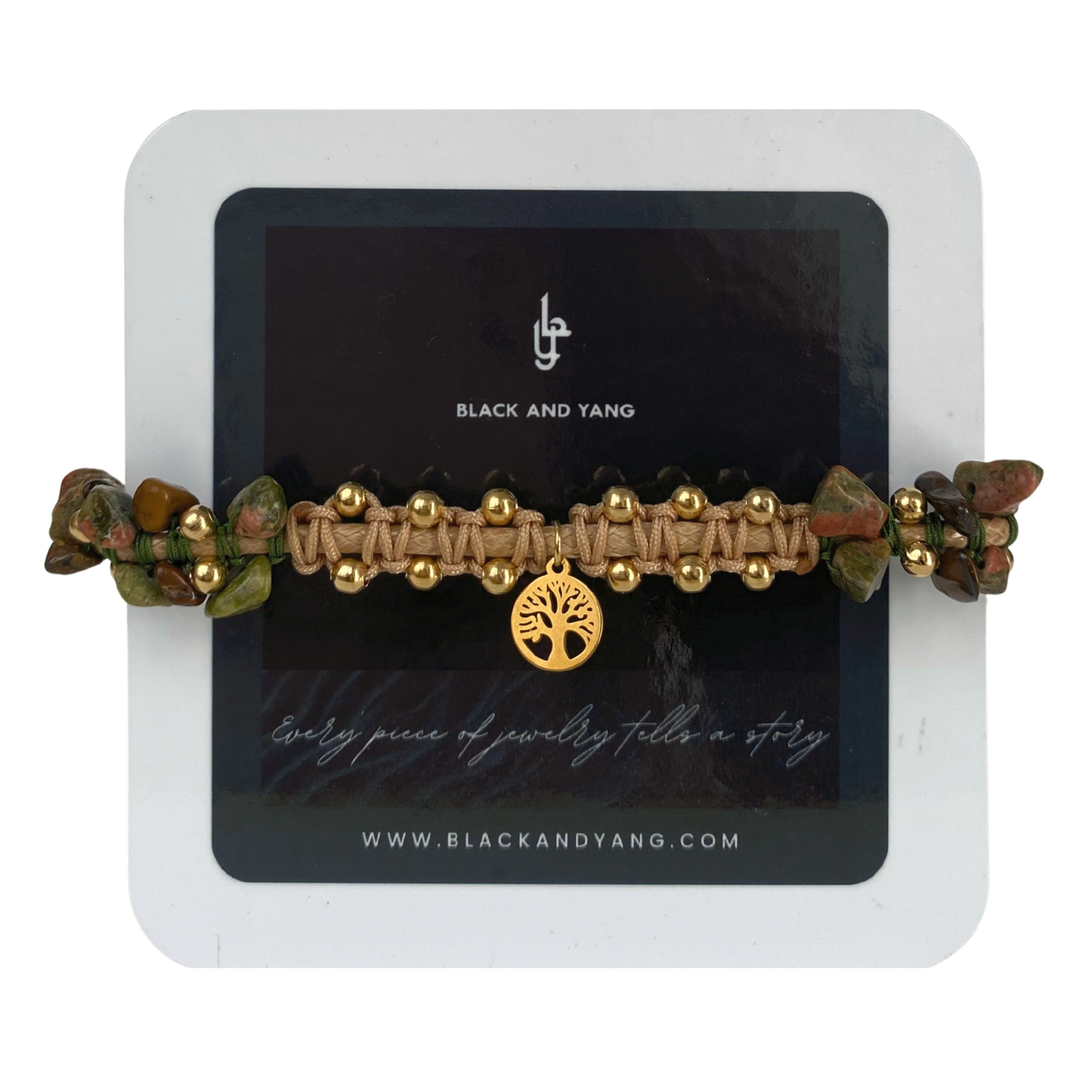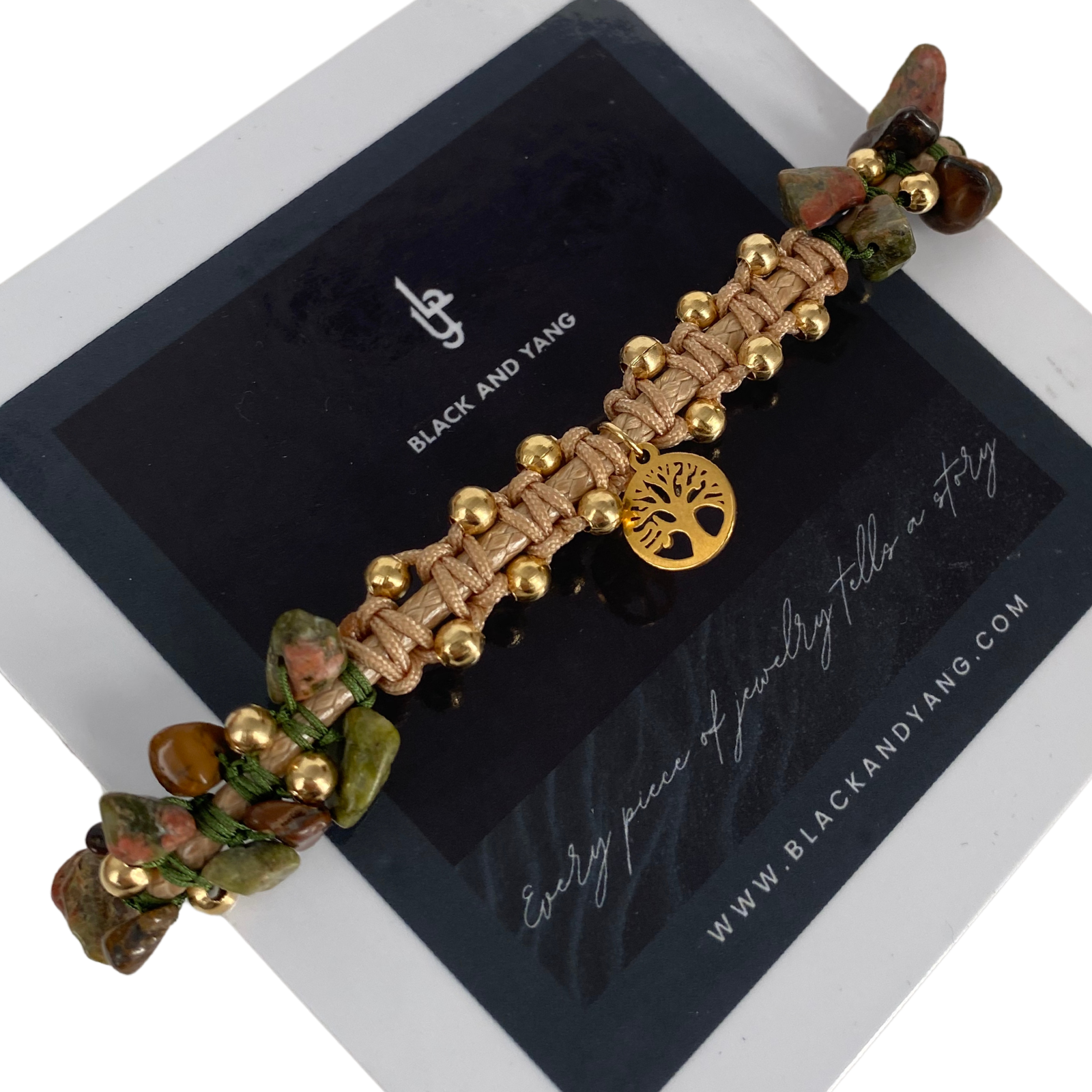 • Realizata cu charm auriu din otel inoxidabil Copacul Vietii si pietre semipretioase unakite si ochi de tigru, toate pe snur bej si snur verde kaki.