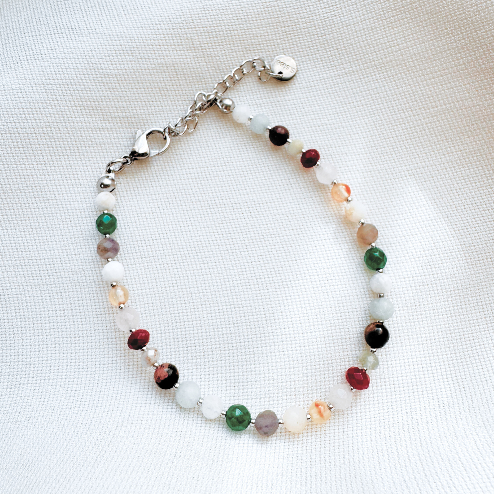 • Realizat cu cristale naturale fatetate si nefatetate de 4 / 4.5 mm : piatra lunii, jad verde, jad bleu, jad grena, carneol, cuart roz, opal, ametist, acvamarin, rodonit