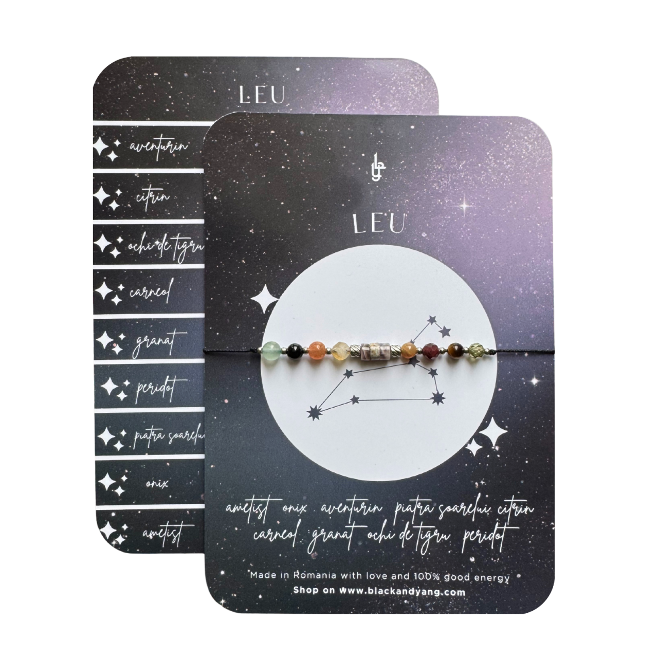Realizata cu pietre semipretioase naturale benefice Zodiei Leu - peridot, citrin, aventurin, ochi de tigru, carneol, granat, piatra soarelui, onix, ametist