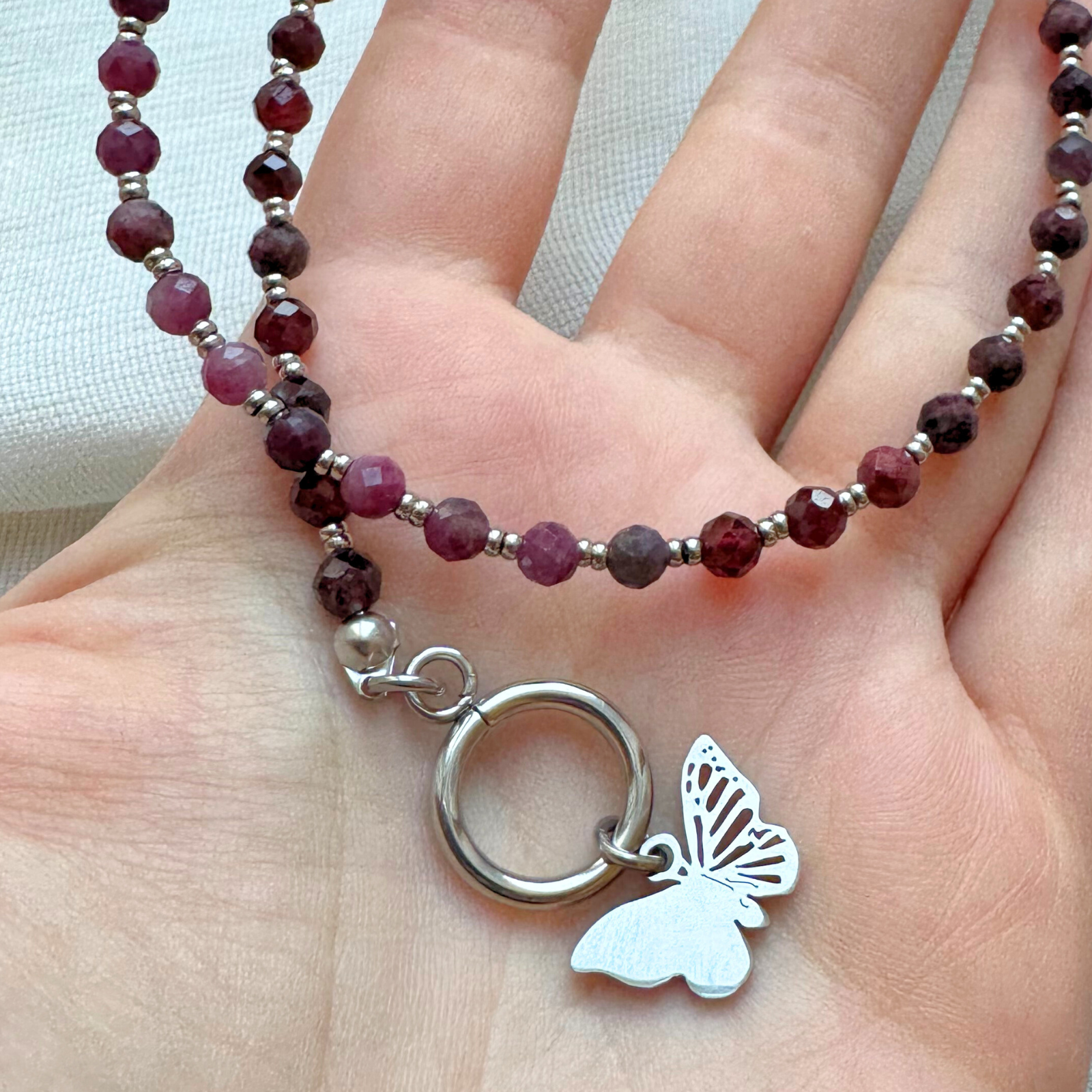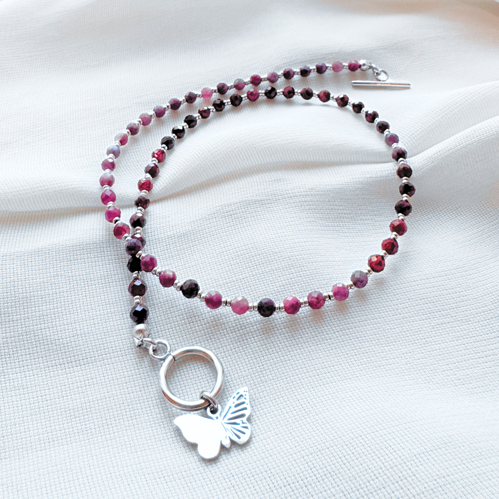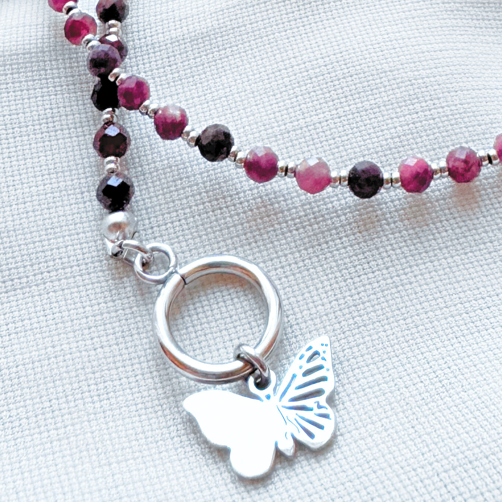 Colier argintiu la baza gatului din turmalina roz si granat cu inchizatoare toggle si pandantiv fluture