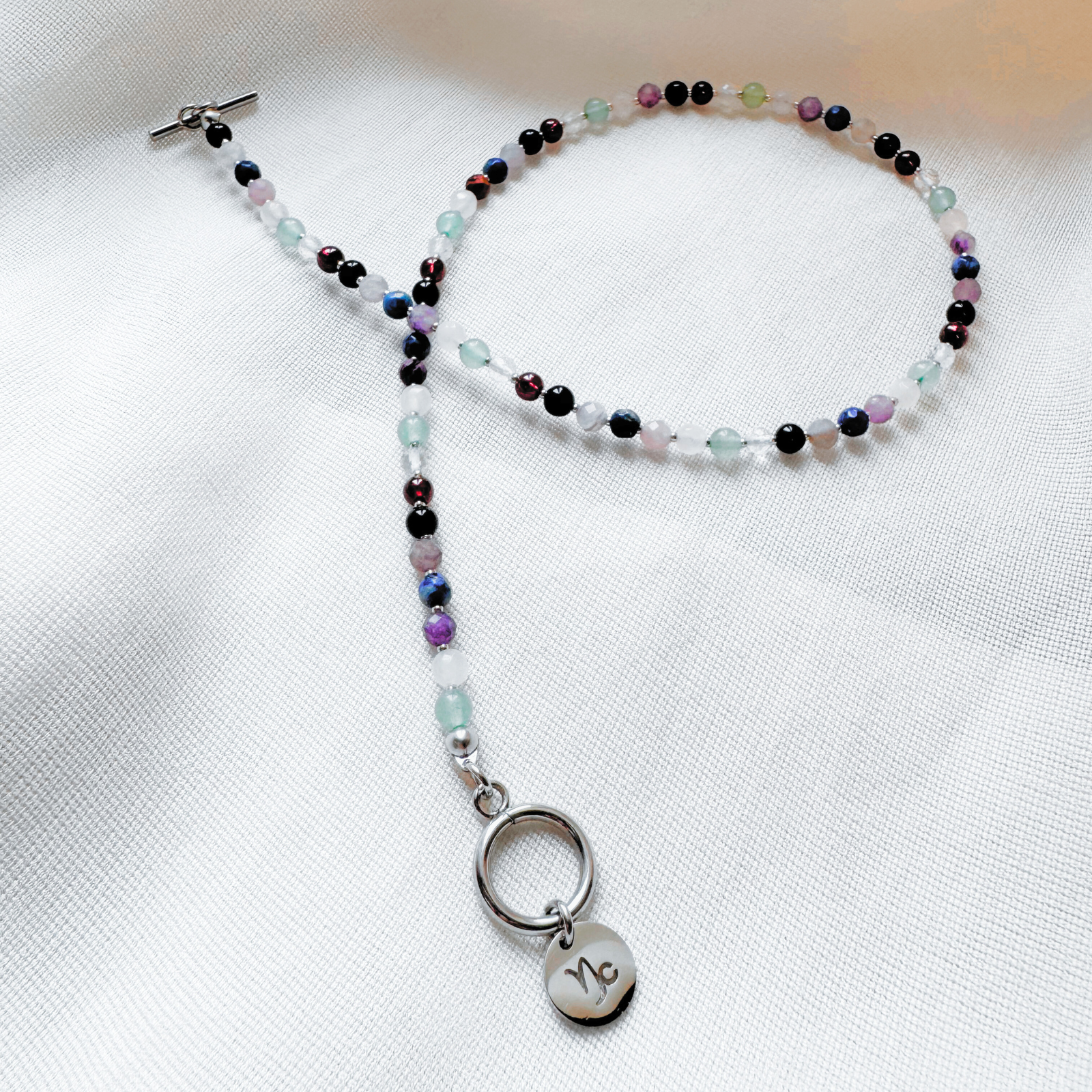 Realizat cu cristale naturale de 4 / 4.5 mm : lepidolit, ametist, granat, onix, lapis lazuli, aventurin verde, cuart roz si cristal de stanca
