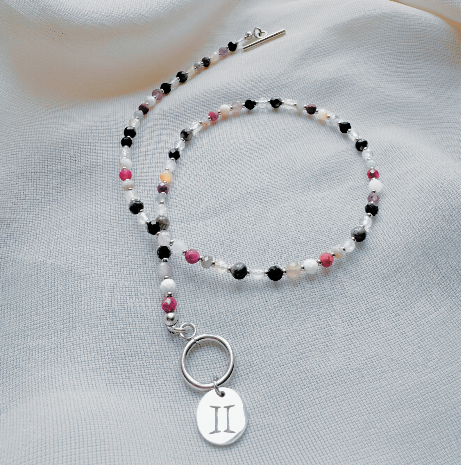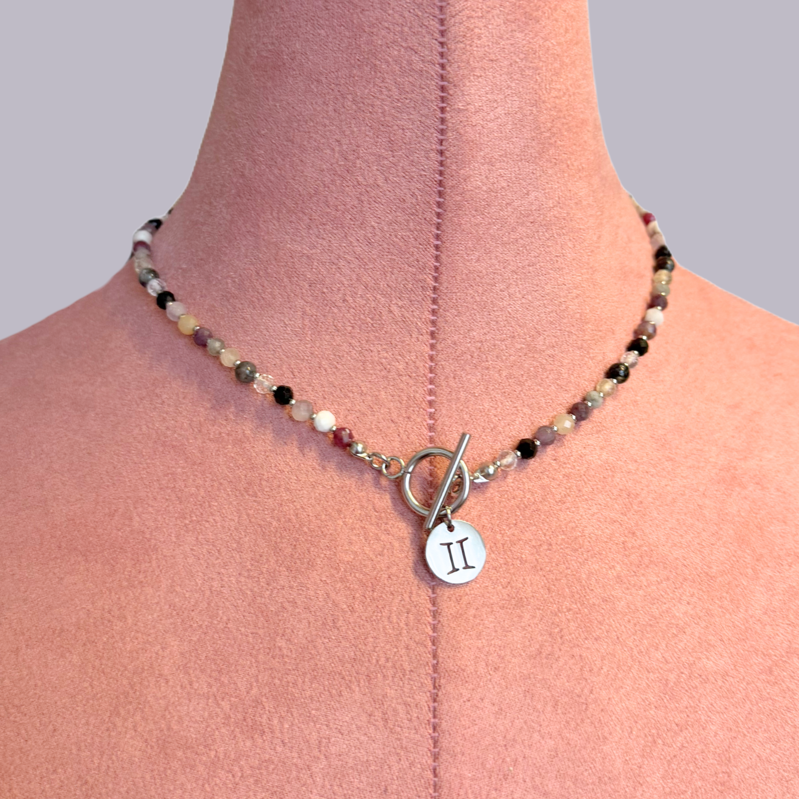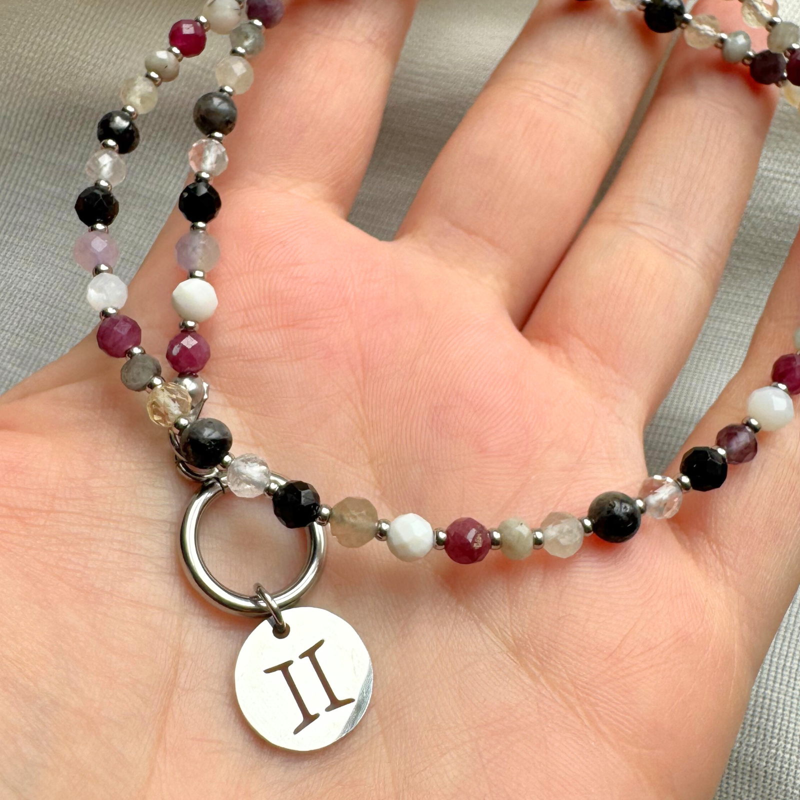 Realizat cu cristale naturale fatetate si nefatetate de 4 / 4.5 mm : turmalina roz, opal, ametist, turmalina neagra, cuart transparent, labradorit, acvamarin, citrin