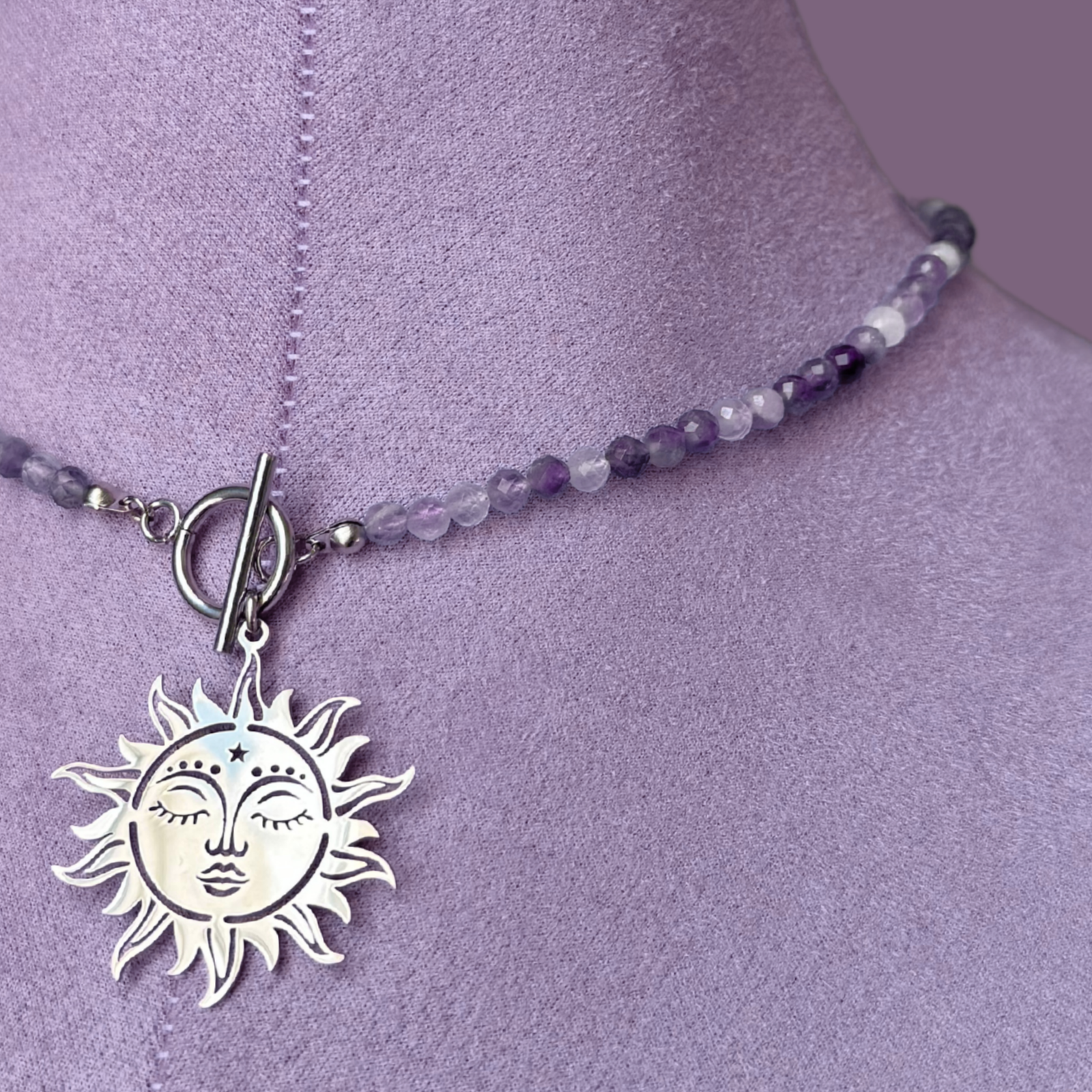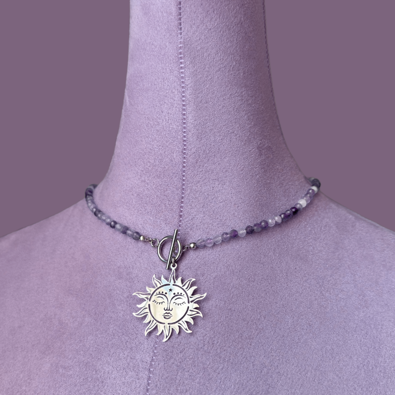 Colier la baza gatului din ametist cu pandantiv soare si inchizatoare toggle