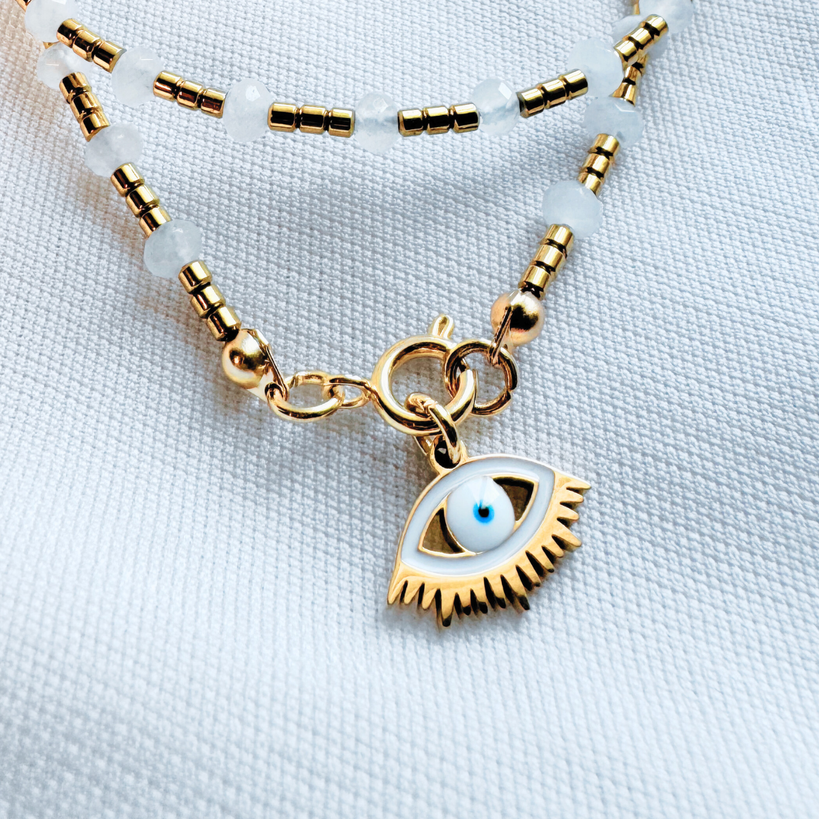 Colier la baza gatului din hematit si jad alb cu pandantiv evil eye