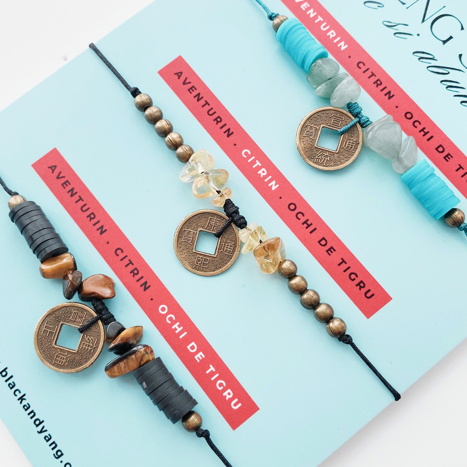 Set bratari moneda chinezeasca Feng Shui cu citrin, aventurin si ochi de tigru - Noroc si abundenta